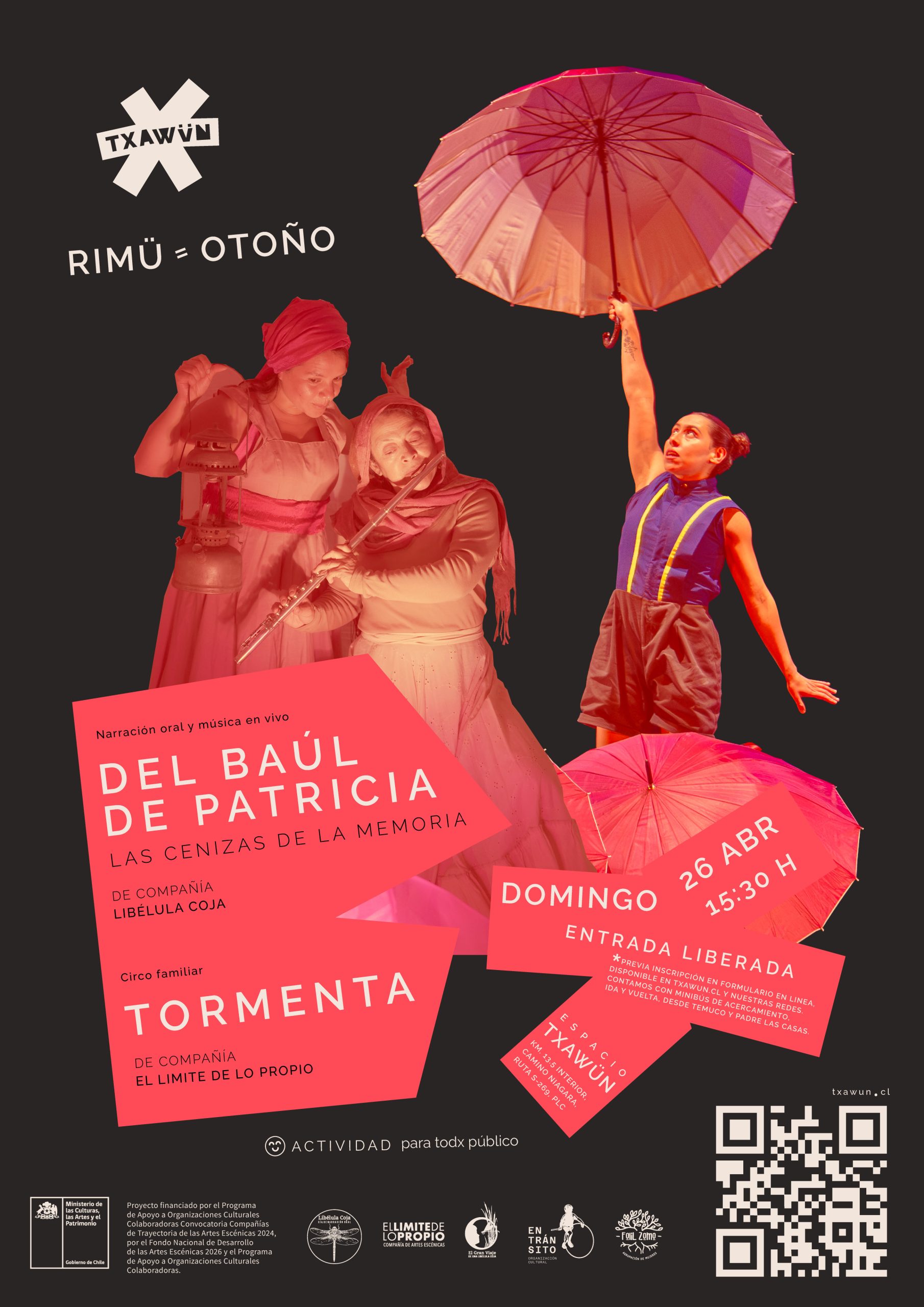A esto se suma Del Baúl de Patricia: Las Cenizas de la memoria, de la compañía Libélula Coja, un espectáculo de narración oral y música en vivo que pone en valor la memoria campesina y la tradición oral del sur de Chile.